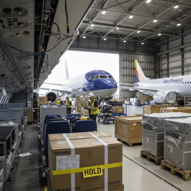 AI image prompt: Photorealistic warehouse scene with stacked aircraft cabin components—seats, lavatory…